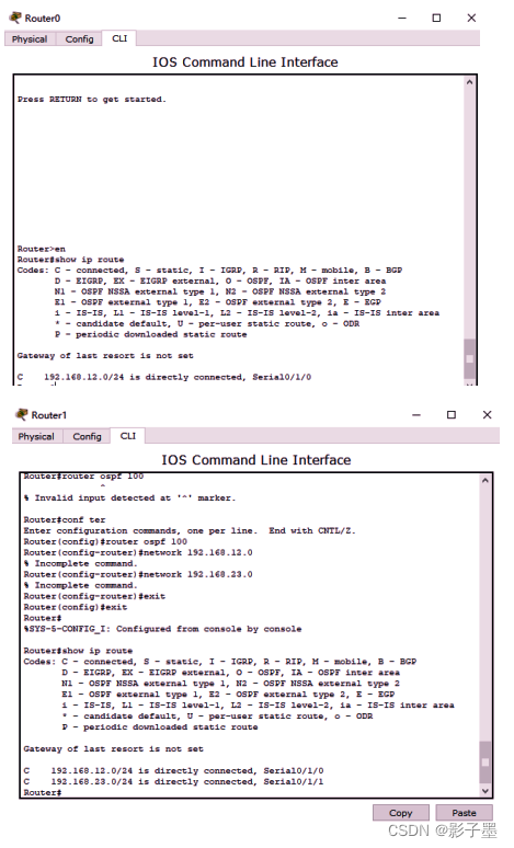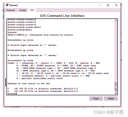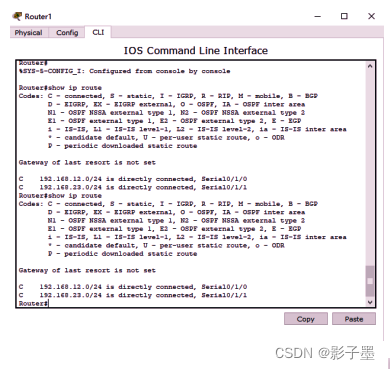 配置完成后,通过“show ip route”命令查看各路由器上的路由表的生成情况,并测试连通性。