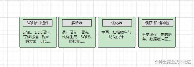 SQL接口组件,这个名词听上去似乎不太容易理解,其实主要作用就是负责处理客户端的SQL语句,当客户端连接建立成功之后,会接收客户端的SQL命令,比如DML、DDL语句以及存储过程、触发器等,当收到SQL语句时,SQL接口会将其分发给其他组件,然后等待接收执行结果的返回,最后会将其返回给客户端。