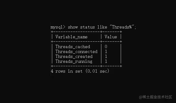 对于几个字段很容易理解,额外要说明的一点是Threads_cached这个字段,从名称上来看,似乎跟缓存有关系,其实也没错,因为这里是有一个数据库内部的优化机制。当一个客户端连接断开后,对于数据库连接却不会立马销毁,而是会先放入到一个缓存连接池当中。这样就能在下次新连接到来时,省去了创建线程、分配栈空间等一系列动作,但这个值不会是无限大的,一般都在32左右。