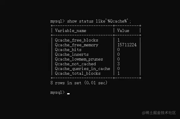 show status like'%Qcache%';命令查询缓存相关的统计信息。