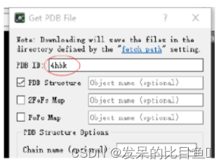 从PDB网站上下载蛋白,如4hbk.pdb.也可以直接通过PyMOL下载蛋白,点击菜单栏中的File->Get PDB.如下图图所示,在PDBID对应的框中填入PDB的编号就可以了,不要包含后缀.pdb。
