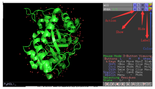 - 1个是4hbk,4hbk就是我们刚刚载入的蛋白每个object 都有对应的ASHLC操作,如下图所示: