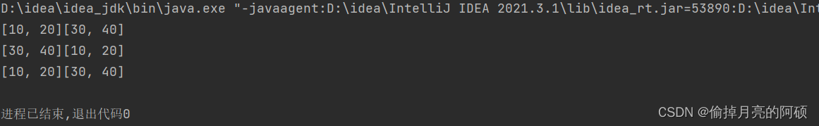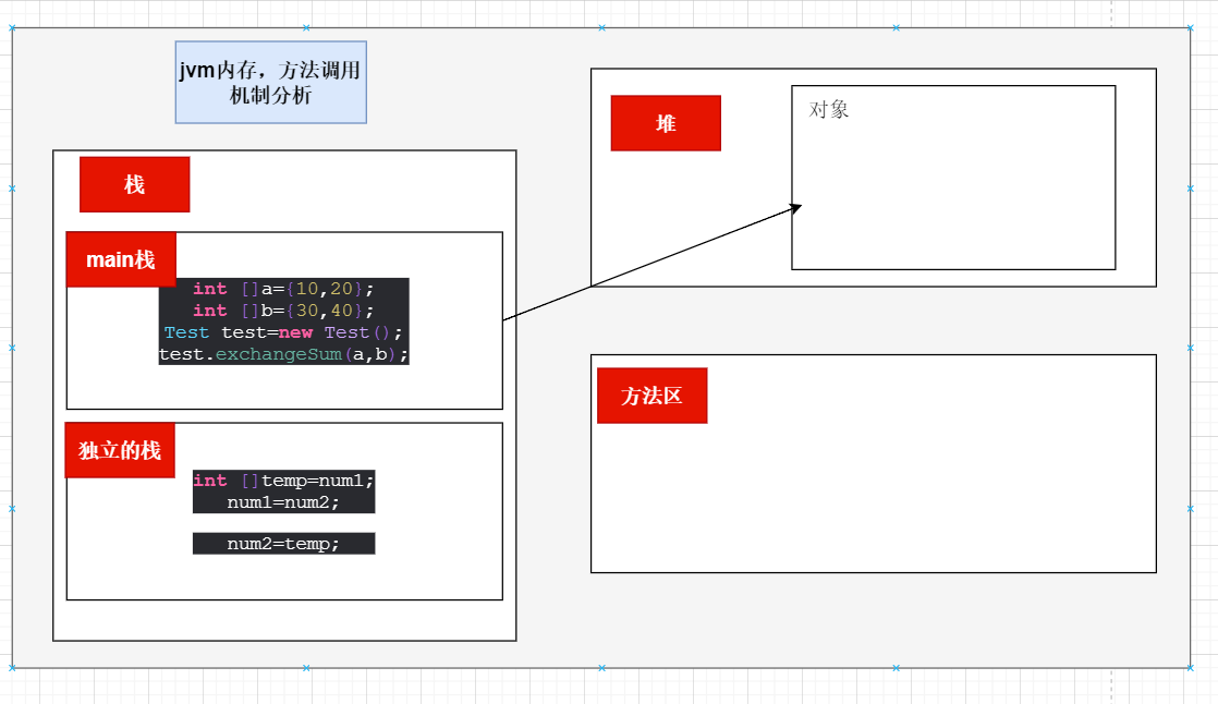 最后我们来观察以下这个例子:可以发现a数组与b数组的交换只是在栈中的独立方法栈中运行的,exchansum函数结束之后,该栈被立即释放掉。虽然a数组与b数组的地址发生了交换,但是这些改变仅仅在方法栈中运行,并没有传回到堆或者main栈,所以改变并不会被记录。