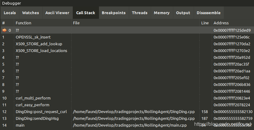 根据现象分析,应该是libcurl在调用与SSL加密相关的函数时走到了不正常的代码中;之所以这么确定是与加密相关的代码是因为之前我们应用程序也集成了libcurl而且功能正常,唯一不同之处就是之前那个应用程序没有连接 https 而是连接 http。