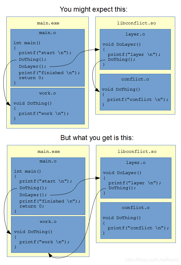 到网上进行了一番检索,发现了这个文章 Shared Library Symbol Conflicts (on Linux),盗用其中一张图说明我们现在的处境: