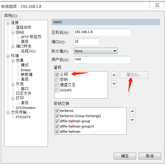2、在C电脑运行SecureCRT.exe软件,点击“文件”->“连接”,打开连接管理对话框。在对话框里点“新建会话”,SecureCRT协议选择“SSH2”,主机名填B服务器的IP地址,端口填22,用户名填root,SecureFX协议选择“SFTP”,鉴权只留“公钥”打对勾。如下图所示: