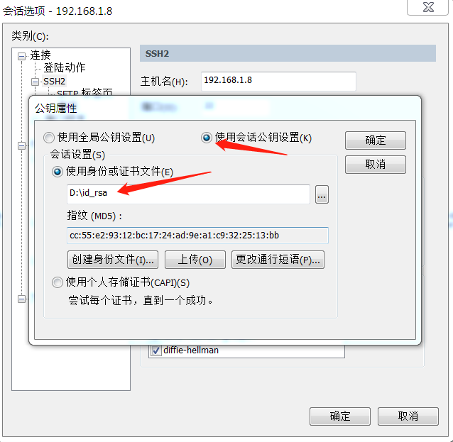 选中“公钥”,点击对话框中的“属性”,在弹出对话框里选择从服务器下载的id_rsa私钥文件(注意,ssh客户端使用的是私钥,而不是公钥。SecureCRT界面写“会话公钥设置”,比较容易误导人)。如下图所示: