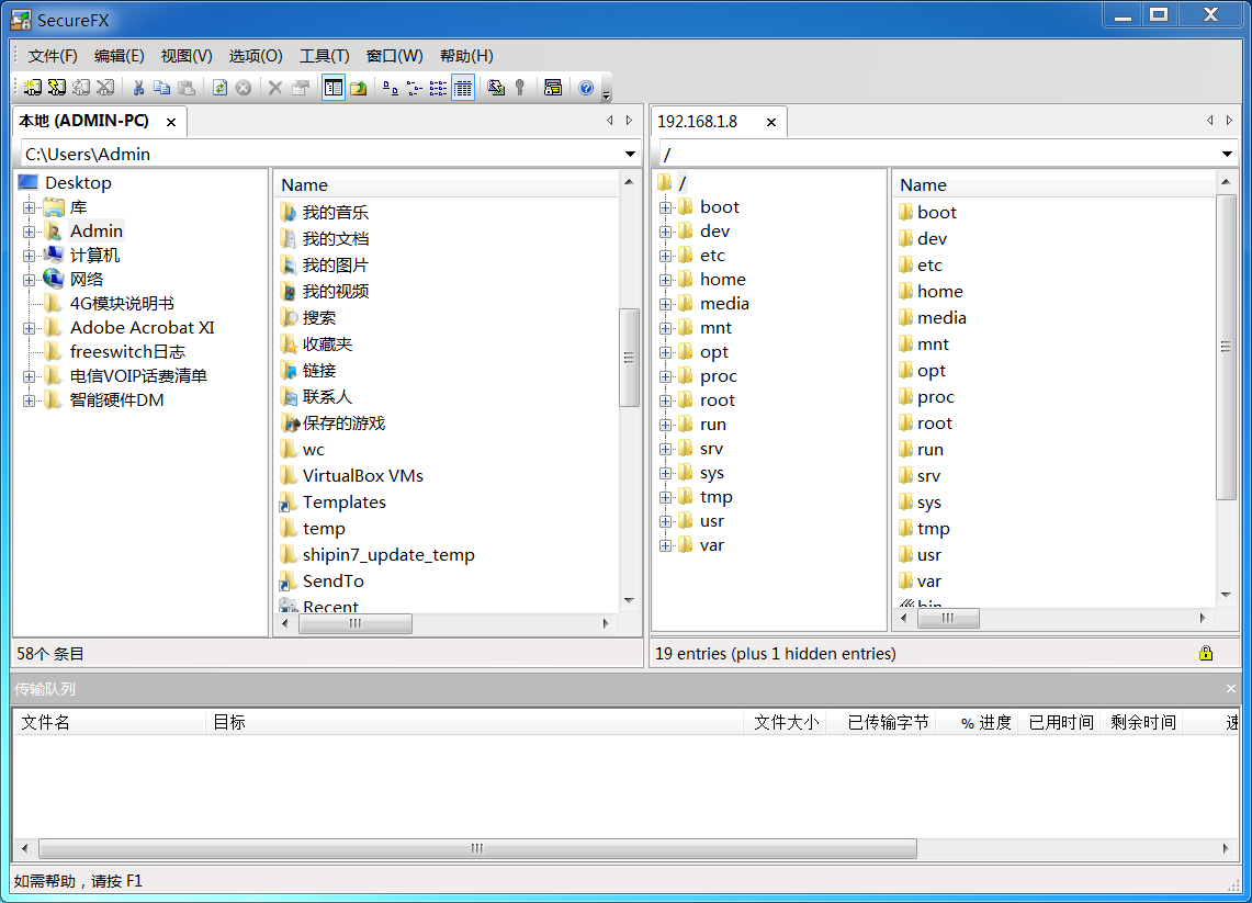 点击SecureCRT的SecureFX图标,打开SFTP对话框,可以上传或者下载文件。如下图所示: