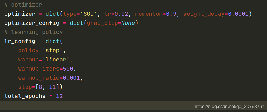 在使用mmdetetion平台时,我们会碰到很多配置文件,其中会涉及到学习率的配置。如下图所示: