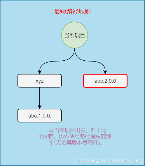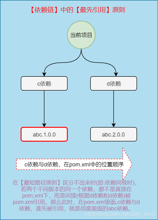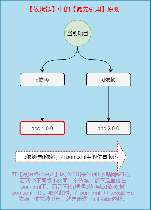 我们不妨以从pom.xml出发,到抵达该依赖时经过的“级”的个数来作为路径长短的标准。