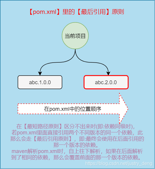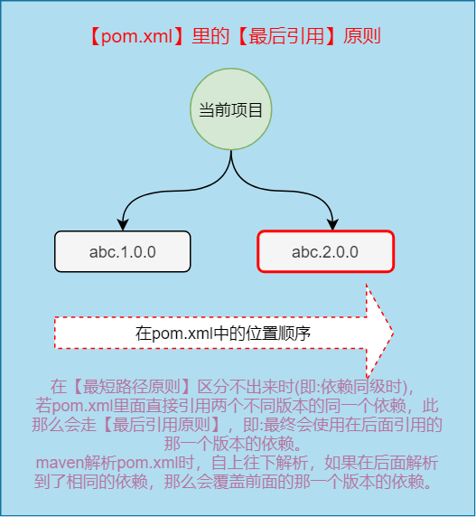 我们不妨把pom.xml里面的引用的依赖视为第一级,那么依赖中各自引用的依赖视为第二级...第三级...