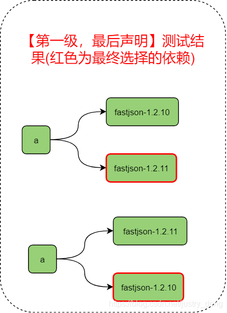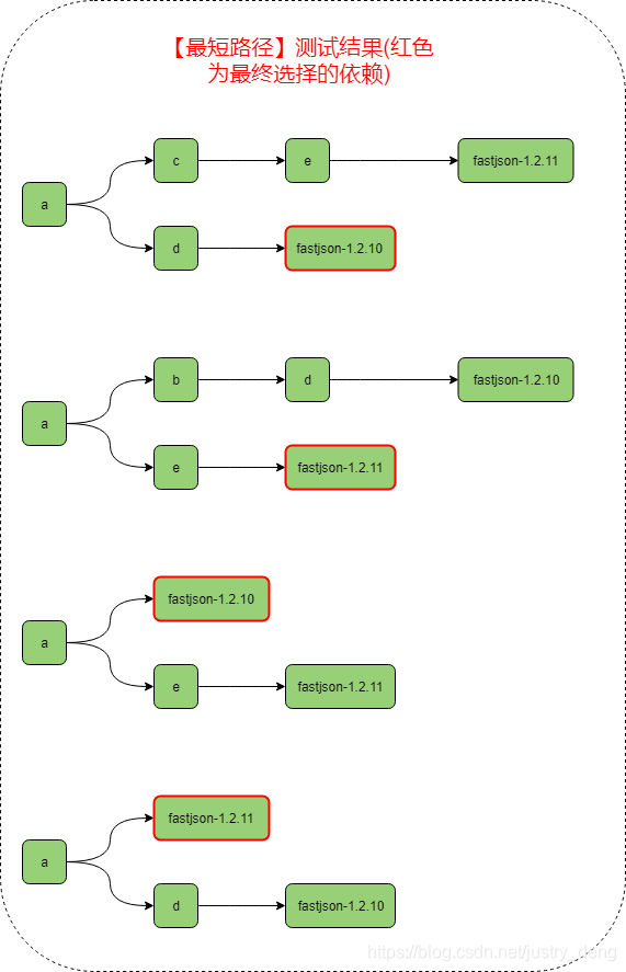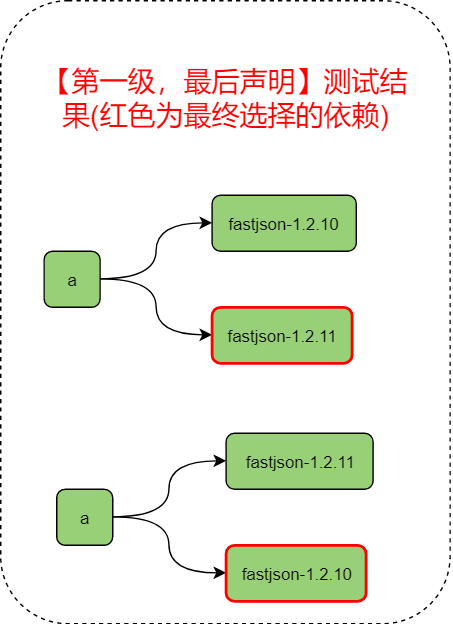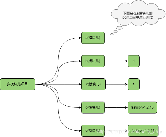 fastjson-1.2.10版本与fastjson-1.2.11版本差别较大,如果是1.2.11版的话,可以在代码中直接new FastJsonConfig();而如果是1.2.10版的话,直接在代码中new FastJsonConfig()的话,是会报错的。在这个的基础上,我们可以通过在a模块儿中直接或间接(通过引入其他模块儿来)引入fastjson的依赖,来判断maven最终引用的是哪一个版本的依赖,进而测试上面的结论。