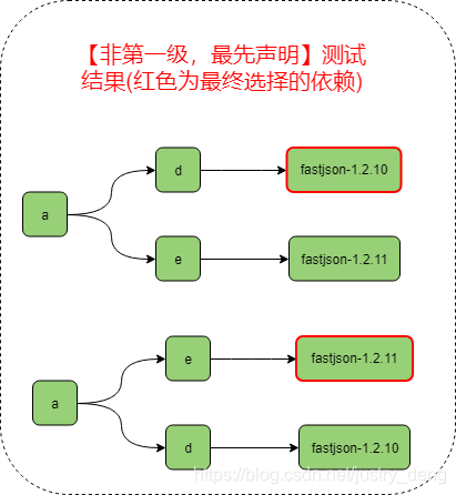 注:按本文中约定的定义,上图中的依赖关系中,d、e是第一级别,fastjson是第二级别。