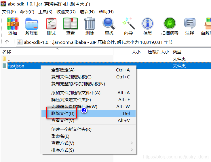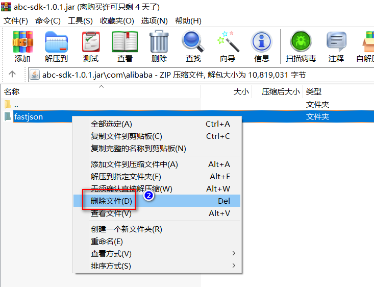 笔者最近使用使用到了某考勤厂商的sdk依赖jar包。该jar包有点特殊,是由gradle构建的,而且貌似构建得不规范;本人将其引入SpringBoot项目后,发生冲突了,需要将该jar包里面的低版本的fastjson去掉;第一种第二种方式都试了,再网上找了一圈页眉找到有效的解决办法,然后回头一想:只要当前环境中存在该jar包需要的依赖就可以了,至于在不在该jar里面就无所谓了,所以我直接使用rar删除了该jar包里面不要的fastjosn包,然后重新将jar包导入项目,冲突就解决了。