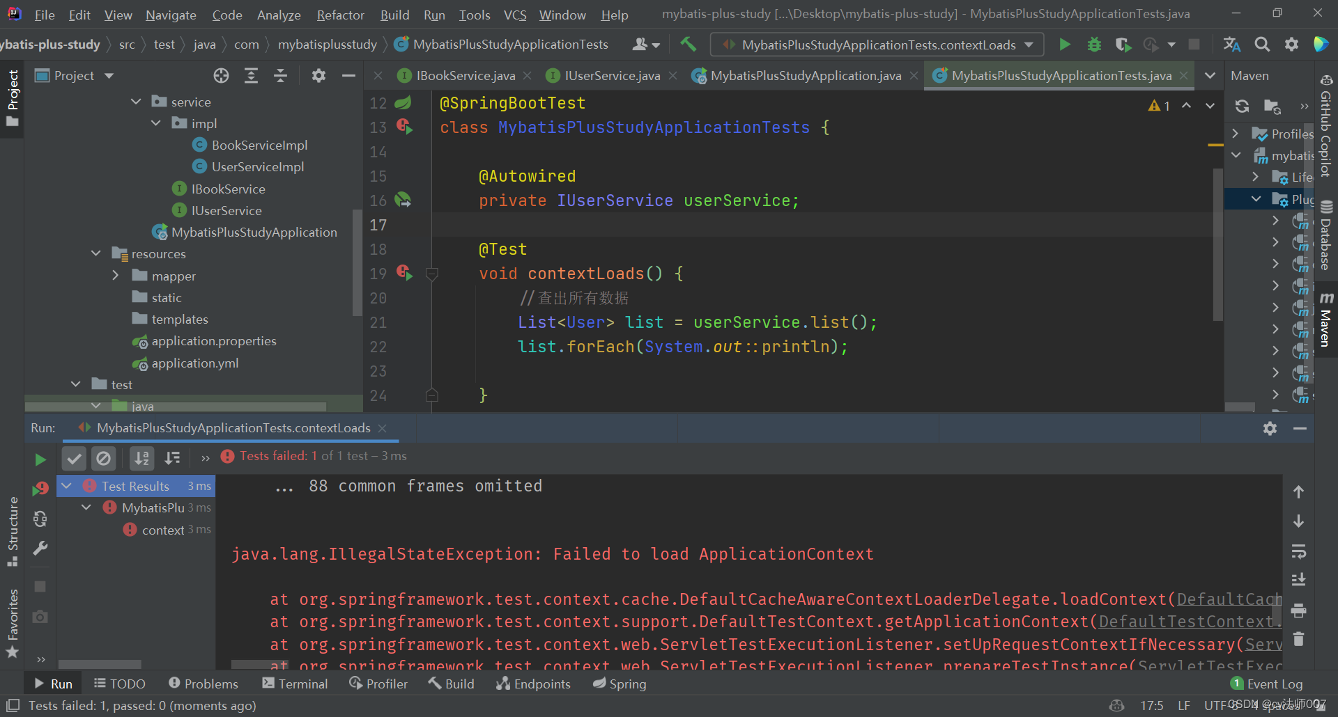 </dependency>在Test中创建MybatisPlusTest,输入以下代码