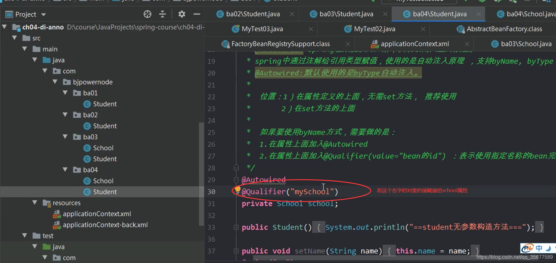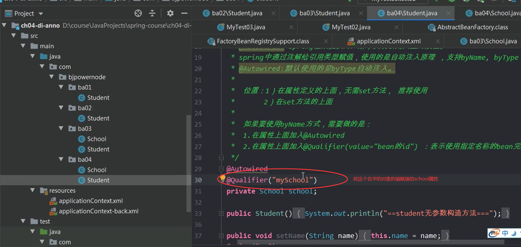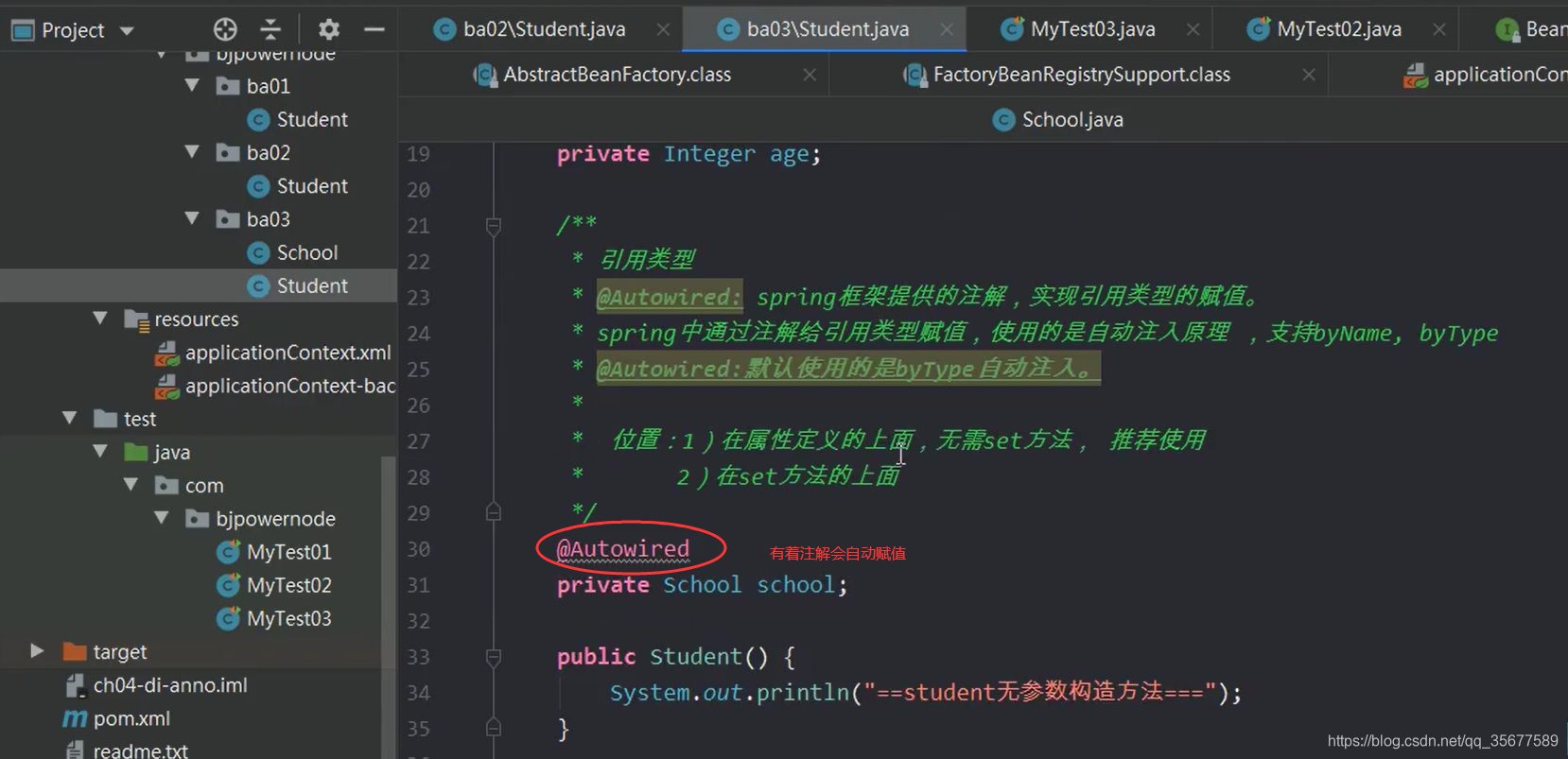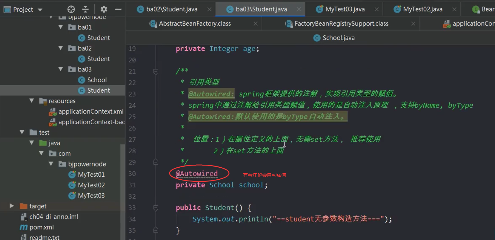 然后在引用属性上面加上Autowired(相当于是创建了一个school中放到容器中,里面的属性已经附好值了,只要用一个程序使用school类型来定义属性,容器就会把创建好的对象赋值给引用数据类型)