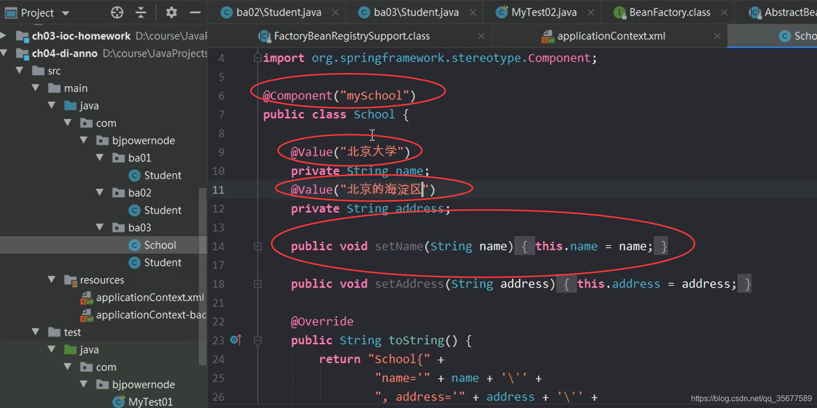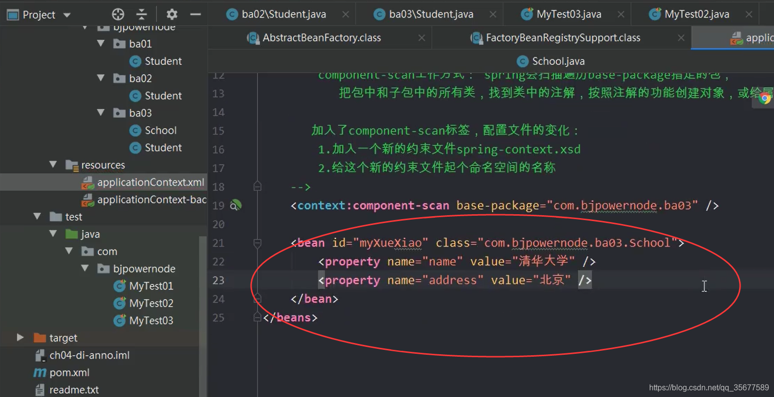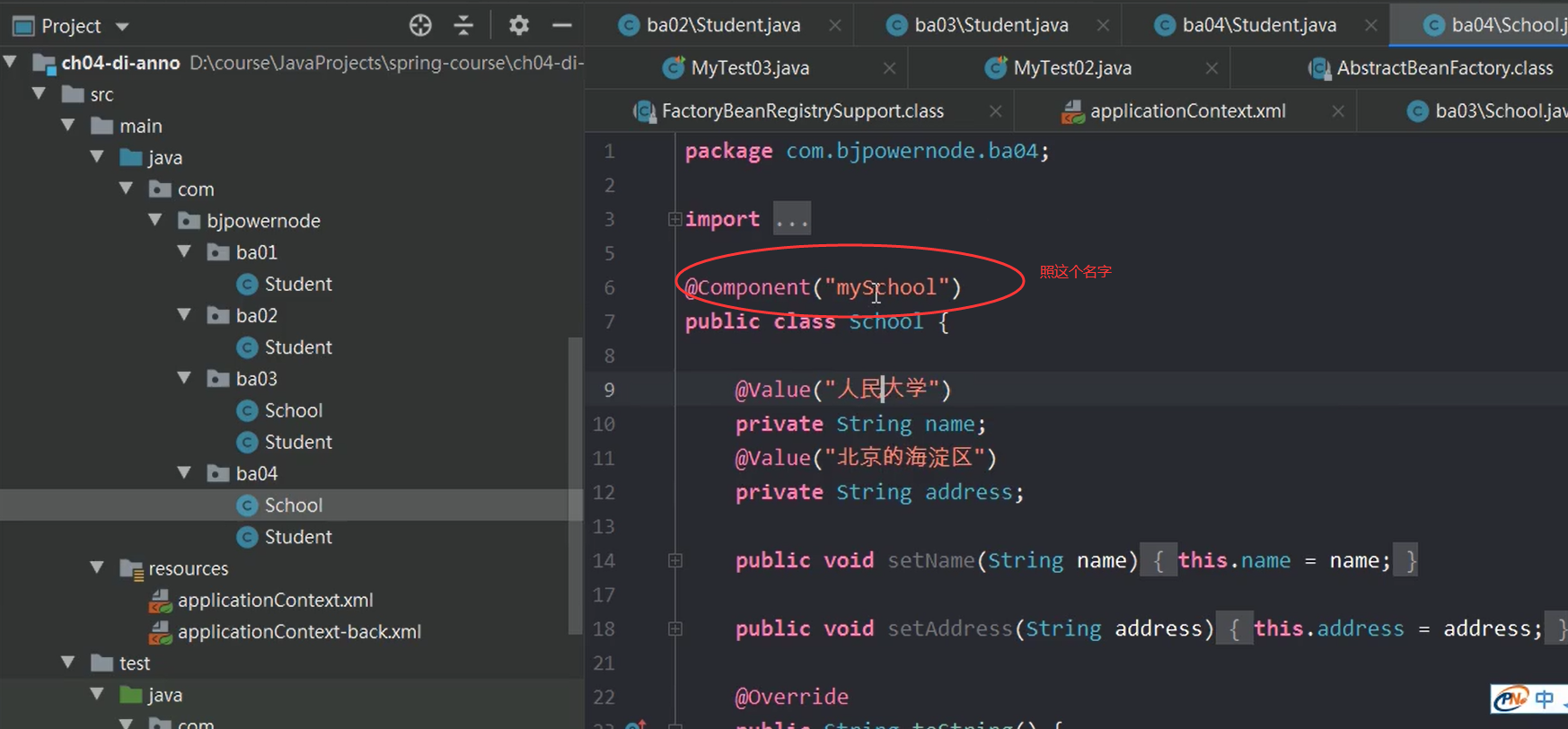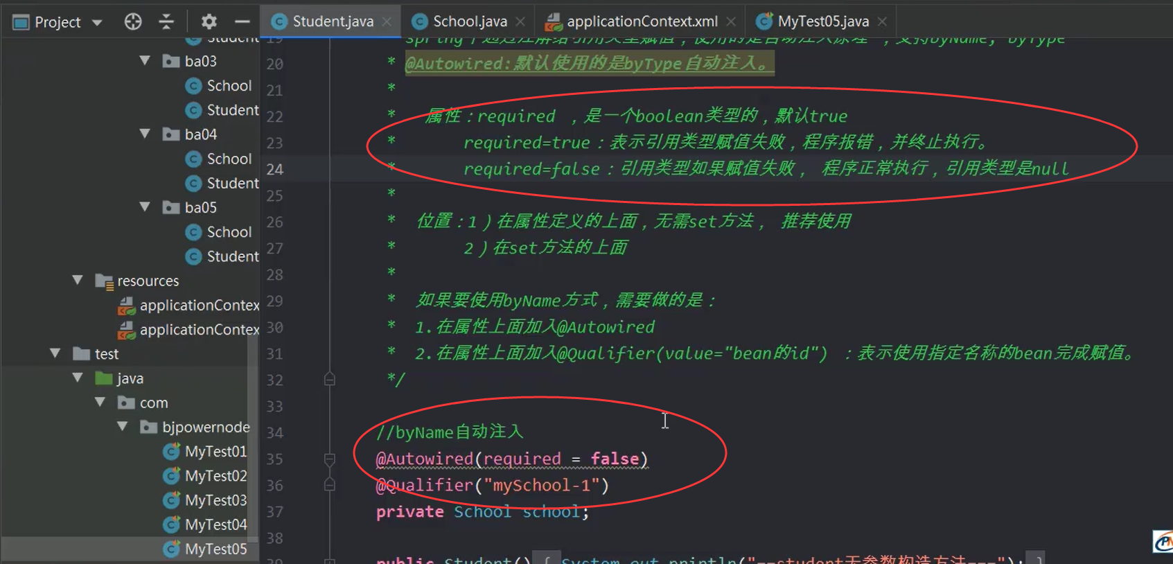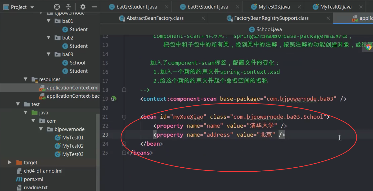 然后在引用属性上面加上Autowired(相当于是创建了一个school中放到容器中,里面的属性已经附好值了,只要用一个程序使用school类型来定义属性,容器就会把创建好的对象赋值给引用数据类型)