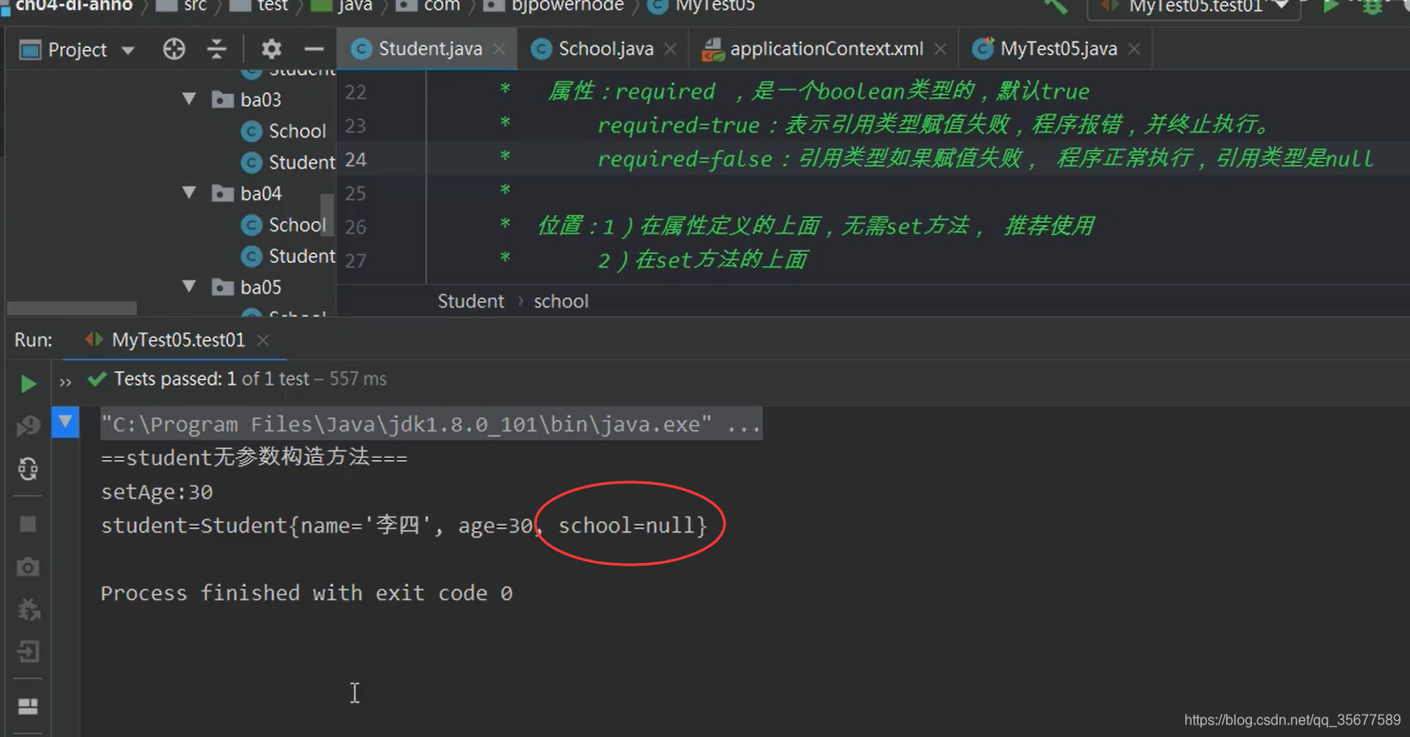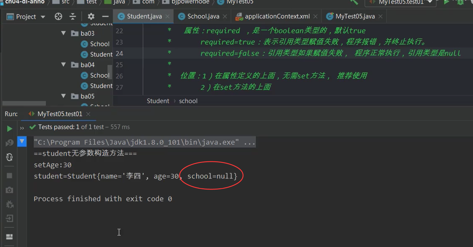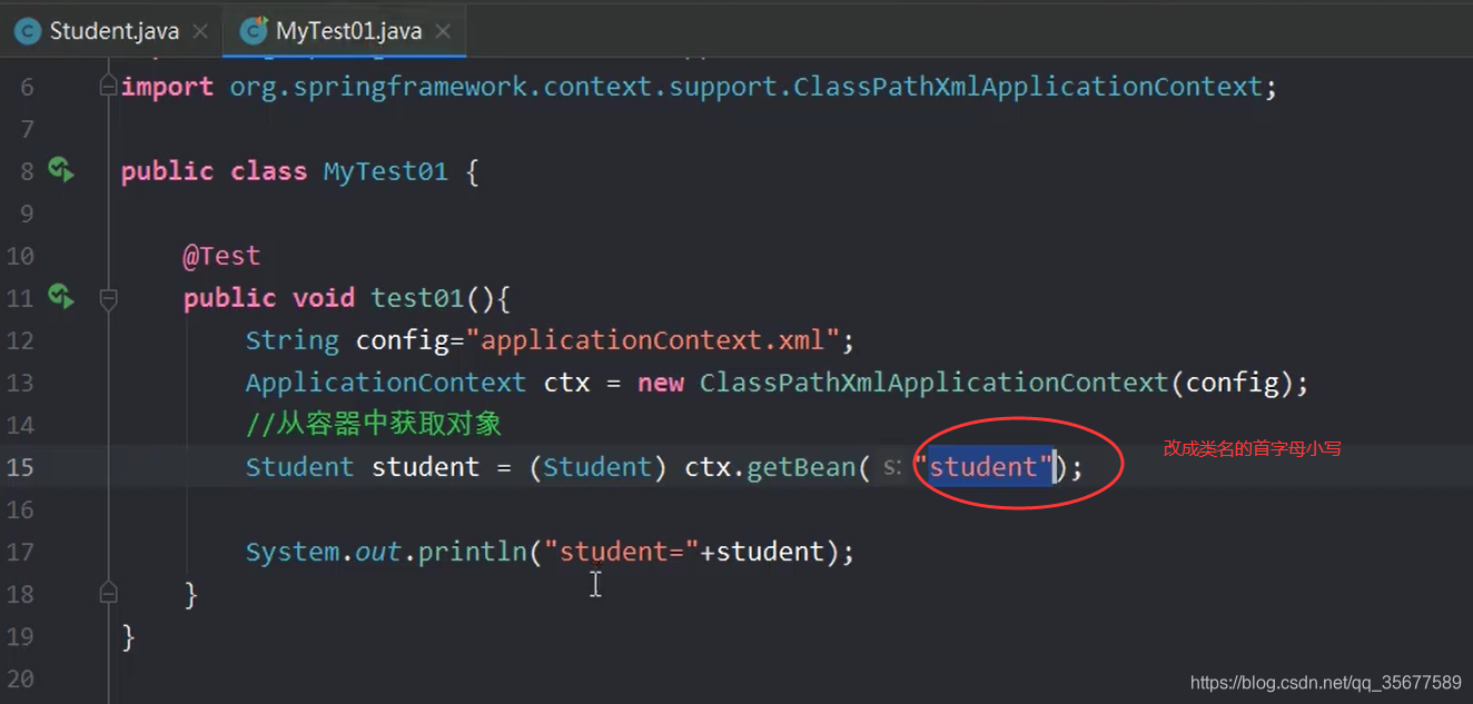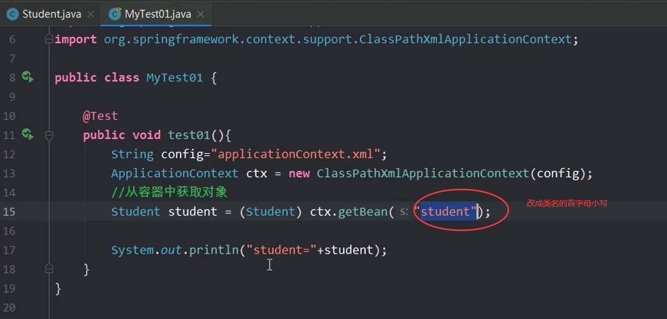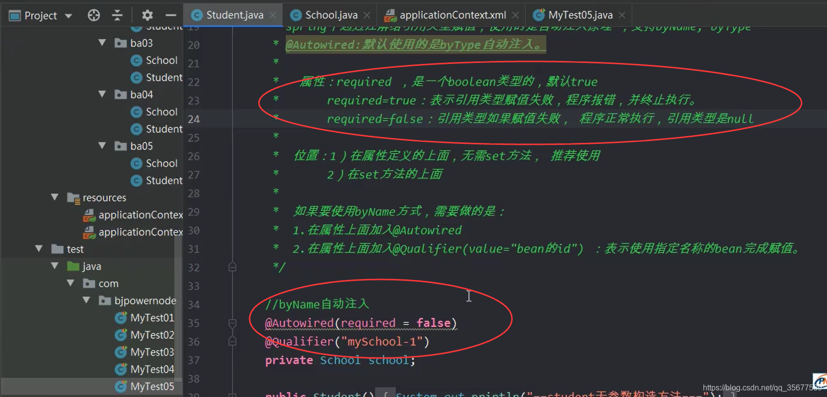 然后在引用属性上面加上Autowired(相当于是创建了一个school中放到容器中,里面的属性已经附好值了,只要用一个程序使用school类型来定义属性,容器就会把创建好的对象赋值给引用数据类型)