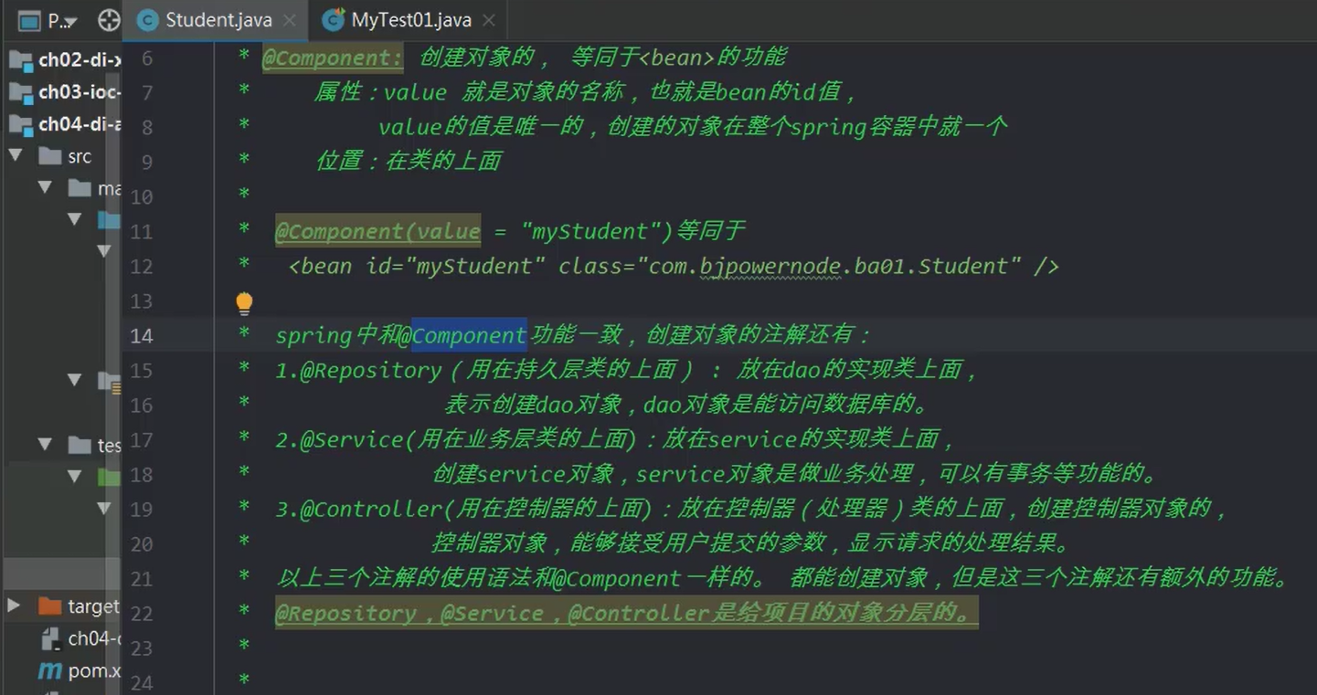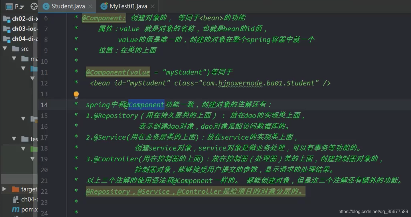 能够创建对象的注解一共有三个,第一个是Component,第二个是Respotory,第三个是Service,第四个是:Controller