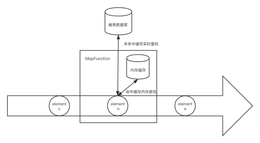 带缓存的数据库查找关联为了解决上述两种关联方式对数据库造成太大压力的问题,可以引入一层缓存来减少直接对数据库的请求。缓存并一般不需要通过 checkpoint 机制持久化,因此简单地用一个 WeakHashMap 或者 Guava Cache 就可以实现。