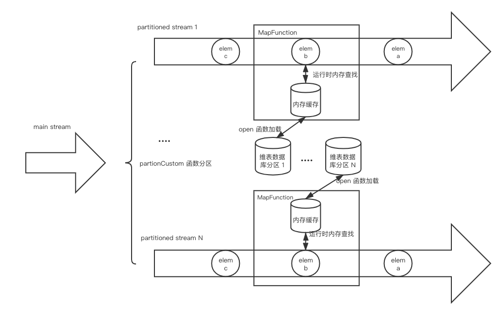 启动预加载分区维表对于维表比较大的情况,可以启动预加载维表基础之上增加分区功能。简单来说就是将数据流按字段进行分区,然后每个 Subtask 只需要加在对应分区范围的维表数据。值得注意的是,这里的分区方式并不是用 keyby 这种通用的 hash 分区,而是需要根据业务数据定制化分区策略,然后调用 DataStream#partitionCustom。比如按照 userId 等区间划分,0-999 划分到 subtask 1,1000-1999 划分到 subtask 2,以此类推。而在 open() 方法中,我们再根据 subtask 的 id 和总并行度来计算应该加载的维表数据范围。