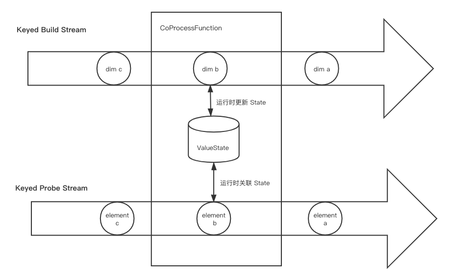 Processing Time 维表变更日志关联如果基于 Processing Time 做关联,我们可以利用 keyby 将两个数据流中关联字段值相同的数据划分到 KeyedCoProcessFunction 的同一个分区,然后用 ValueState 或者 MapState 将维表数据保存下来。在普通数据流的一条记录进到函数时,到 State 中查找有无符合条件的 join 对象,若有则关联输出结果,若无则根据 join 的类型决定是直接丢弃还是与空值关联。这里要注意的是,State 的大小要尽量控制好。首先是只保存每个 key 最新的维度数据值,其次是要给 State 设置好 TTL,让 Flink 可以自动清理。