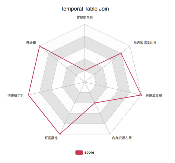 这种方式实际是带缓存的数据库查找关联的衍生,不同之处在于相比冷启动时未命中缓存导致的多次实时数据库访问,该方式直接批量拉取整个维表效率更高,但也有可能拉取到不会访问到的多余数据。下面雷达图中显示的是用异步数据库查找,如果是同步数据库查找吞吐量上会低一些。