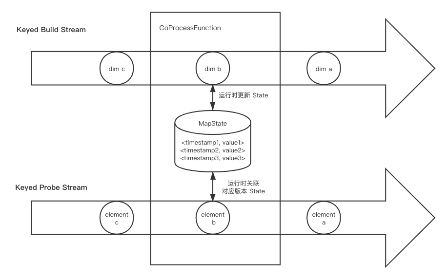 总体思路是使用一个 CoProcessFunction,将 build 数据流以时间版本为 key 保存在 MapState 中(与基于 Event Time 的维表变更日志关联相同),再将 probe 数据流和输出结果也用 State 缓存起来(同样以 Event Time 为 key),一直等到 Watermark 提升到它们对应的 Event Time,才把结果输出和将两个数据流的输入清理掉。