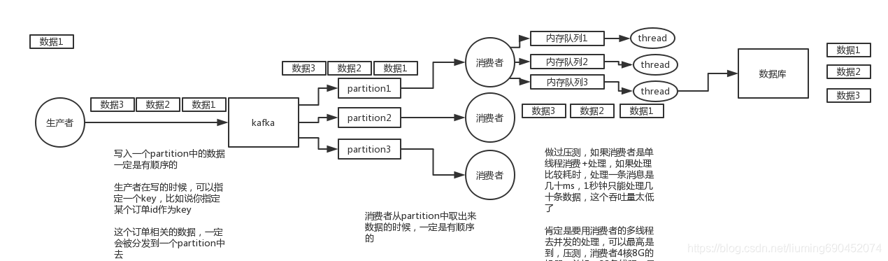(2)kafka:一个topic,一个partition,一个consumer,内部单线程消费,写N个内存queue,然后N个线程分别消费一个内存queue即可