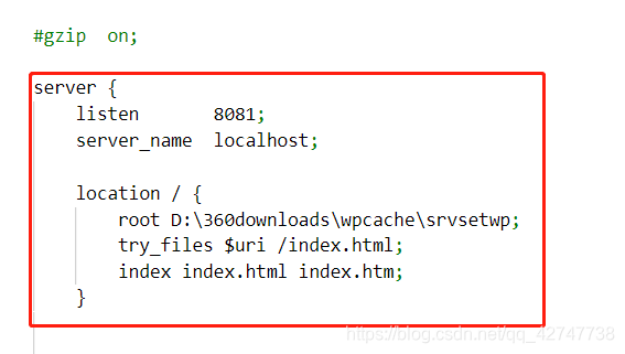 图片服务器的配置也很简短只需要修改下nginx安装目录下的conf-->nginx.conf文件,添加下图就可以在浏览器访问该文件夹下的文件了