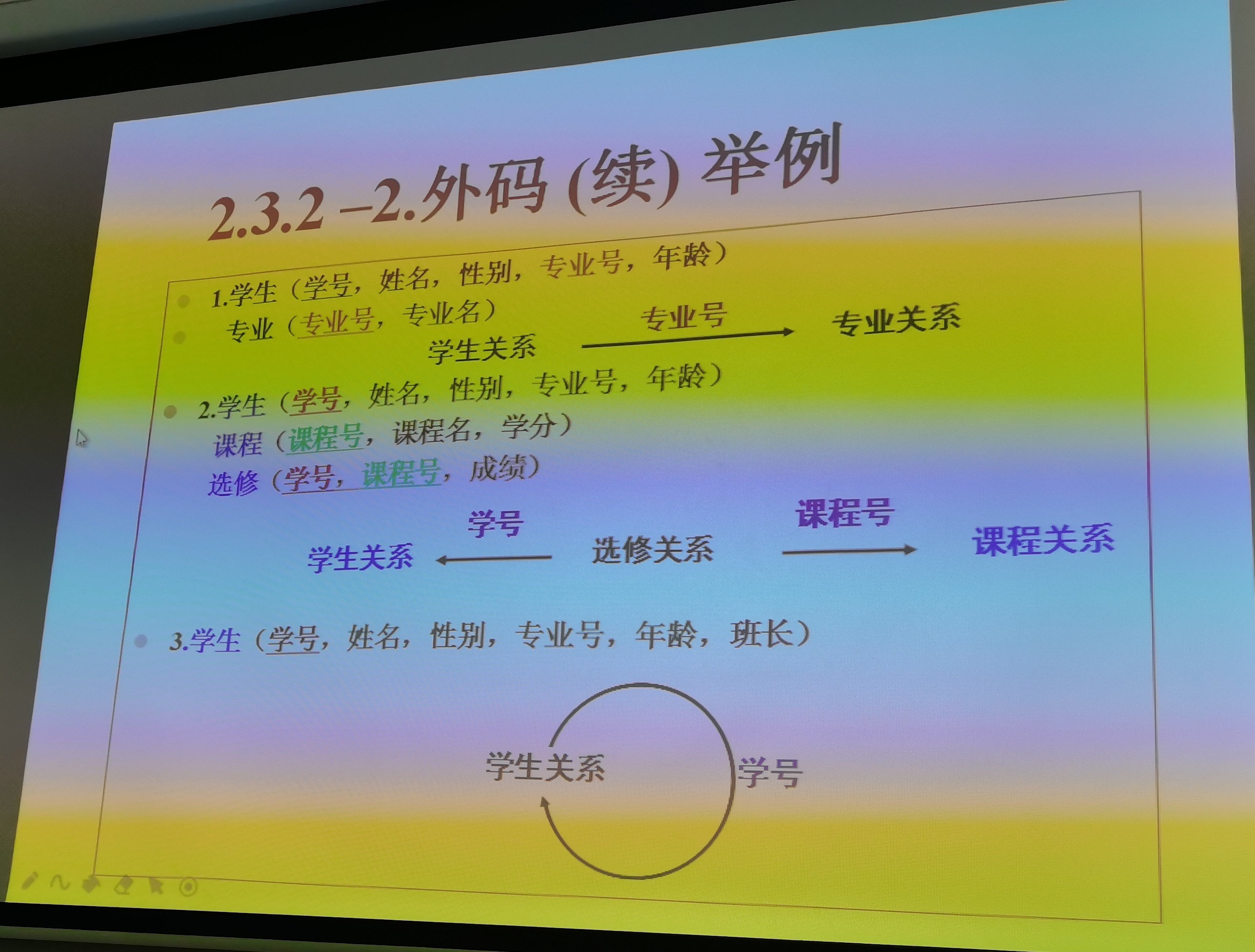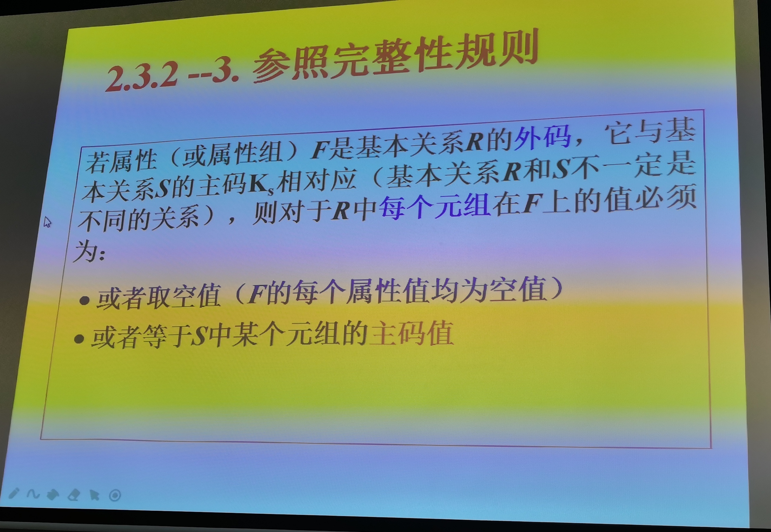 11、外码:一个或一组属性。不是本关系的码,且是另一个关系的主码。本关系为参照关系,另一个关系为被参照关系。