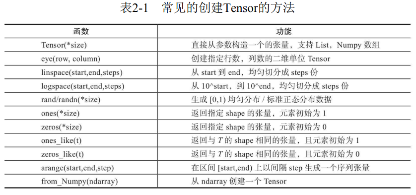 创建Tensor的方法有很多,可以从列表或ndarray等类型进行构建,也可 根据指定的形状构建。