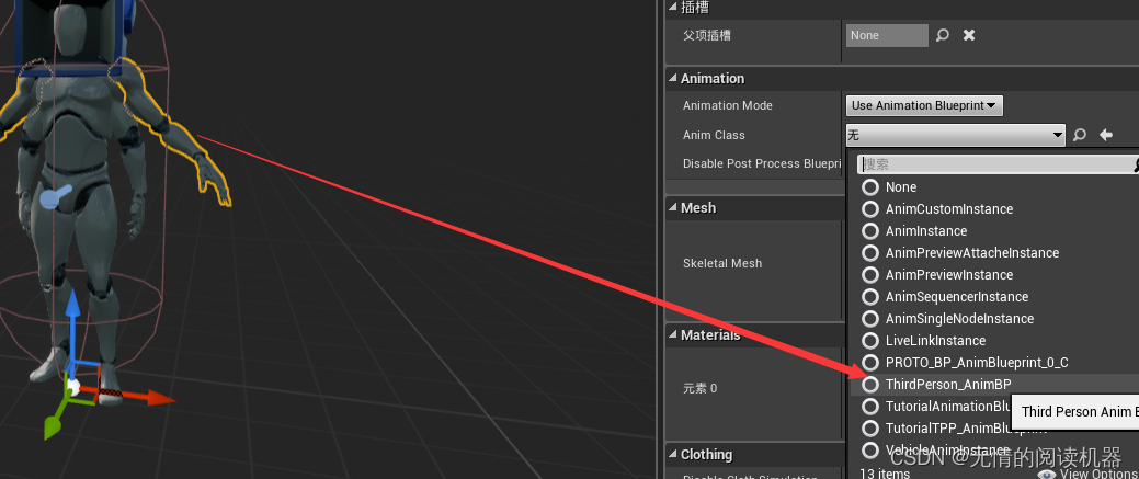 为什么姿势不一样呢,因为手臂mesh还没有启用小白人的动画蓝图类。现在启用一下。