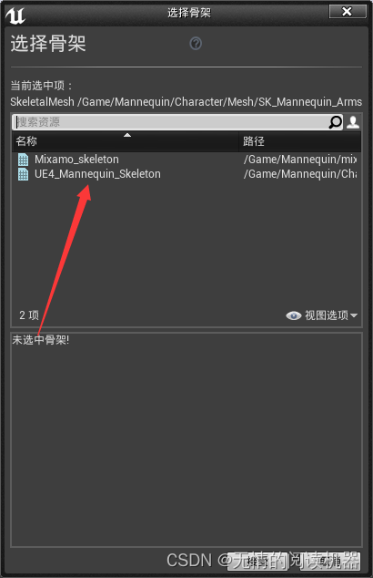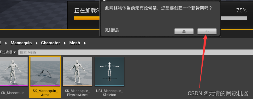提示我们手臂mesh目前没有对应的骨骼,是否新建骨骼,我们选择否。