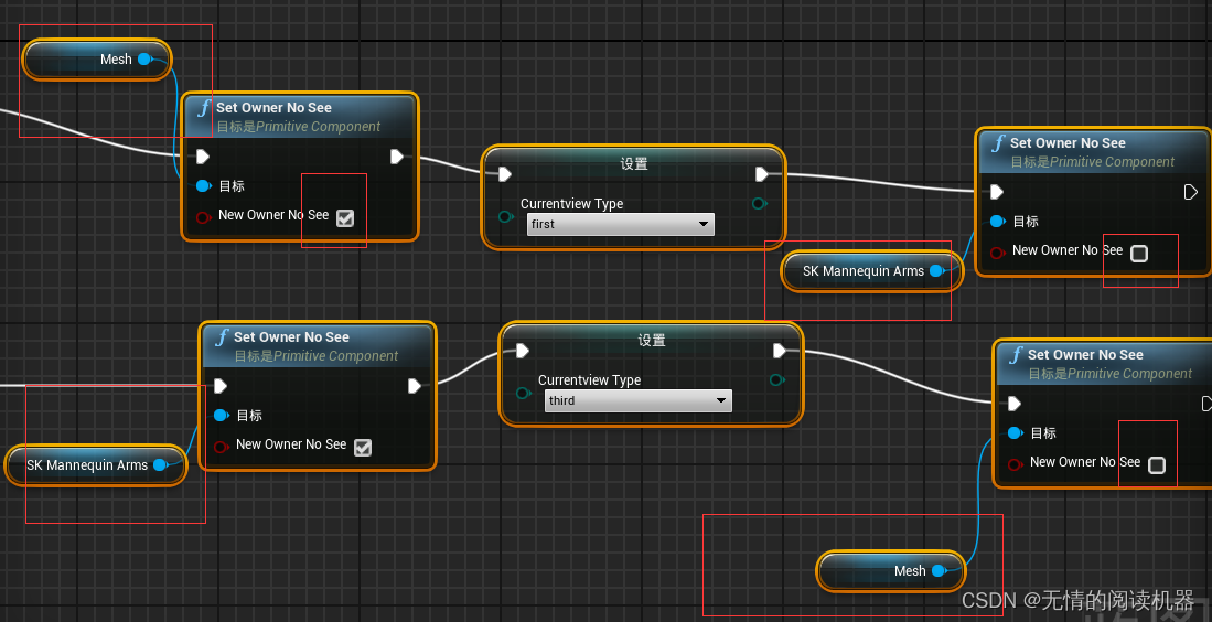 所以,我们在第一人称的时候只显示手臂,第三人称的时候只显示小白人mesh就可以了。