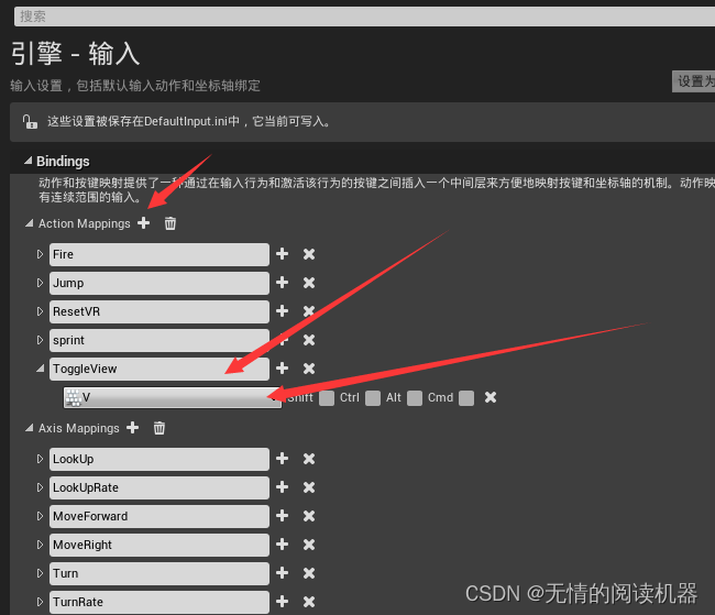 在项目设置里面,新增加input设置ToggleView输入事件,输入为键盘v