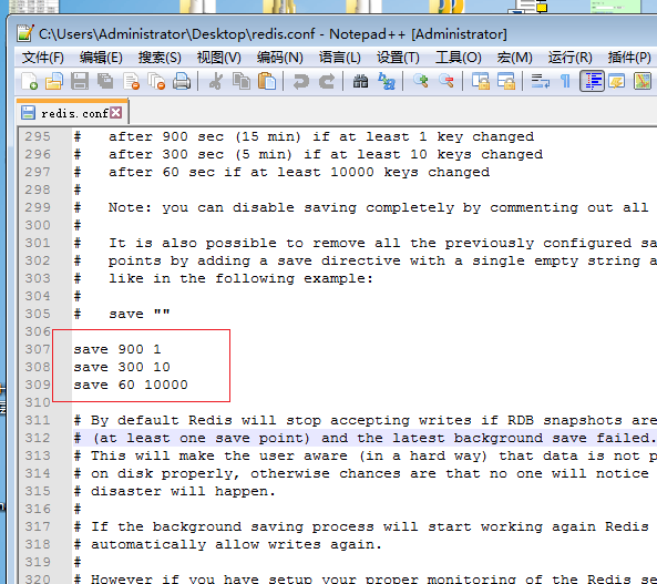 save 300 10 :表示 300 秒内至少 10 个键被更改则进行快照。
