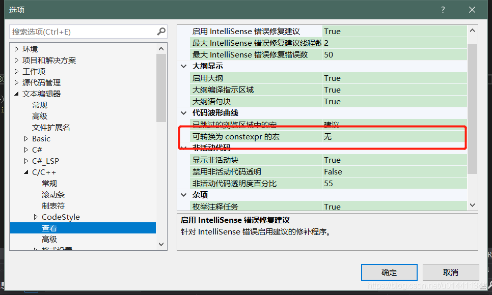 在工具——>选项——>文本编辑器——>C/C++——>查看中,将“可转化为constexpr的宏”更换为“无”即可。如下图