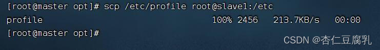 将master虚拟机上环境变量配置文件分发到slave1,执行: scp /etc/profile root@slave1:/etc/profile