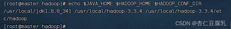 查看三个配置的环境变量,执行:echo $JAVA_HOME $HADOOP_HOME $HADOOP_CONF_DIR