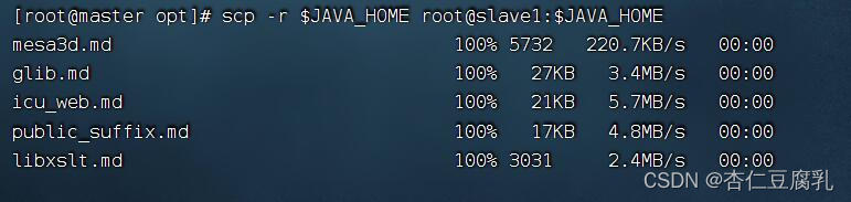 执行:scp -r $JAVA_HOME root@slave1:$JAVA_HOME 【-r: recursive 递归】