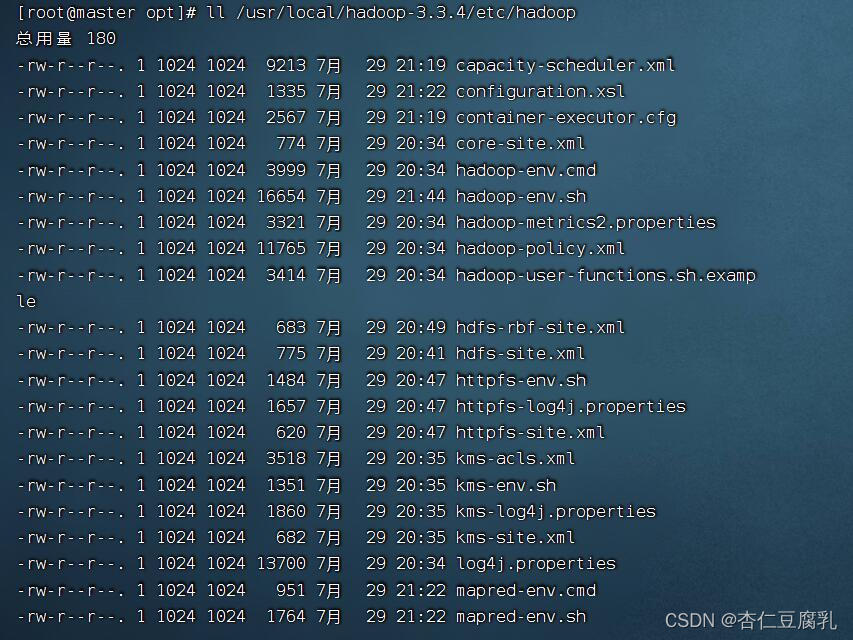 主要配置Hadoop,查看etc/hadoop, 执行:ll /usr/local/hadoop-3.3.4/etc/hadoop