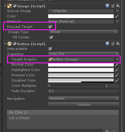 四、按钮的target graphic属性没有赋值,这个属性必须赋值。可以在按钮物体上添加一个Text组件或者Image组件来作为按钮的target graphic。(同时,这个作为target graphic的对象必须勾选Raycast Target)