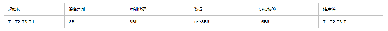 消息中间字符间发送的时间间隔最长不超过1秒,否则接受的设备将认为传输错误。一个典型的消息帧如下所示: