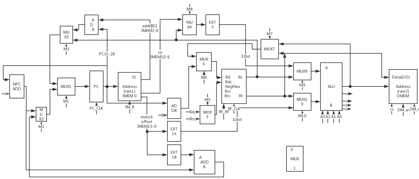 我们在用verilog实现这个cpu的时候,一般是先把各个部件单独写一个module,然后再串联起来,这张图就是帮助我们连接各个部件的(通过输入输出关系)