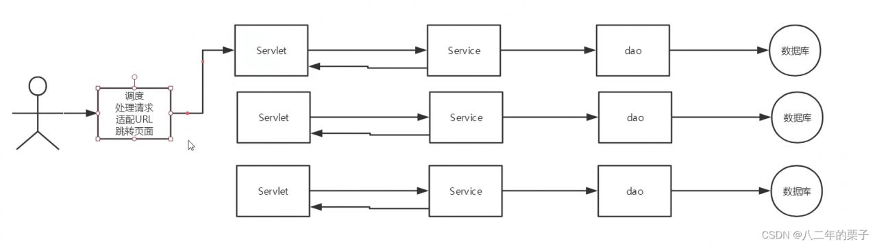 Model2:相对于Model1来说,职责分工更为明确,在Model1的基础上,抽取了Servlet层,体现了一个分层的思想,适合大型的项目开发!(当时的评判标准是适合大型项目开发的,现在看起来已经过时了!)