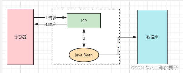 Model1的开发模式是:JSP+JavaBean的模式,它的核心是Jsp页面,在这个页面中,Jsp页面负责整合页面和JavaBean(业务逻辑),而且渲染页面,它的基本流程如下: