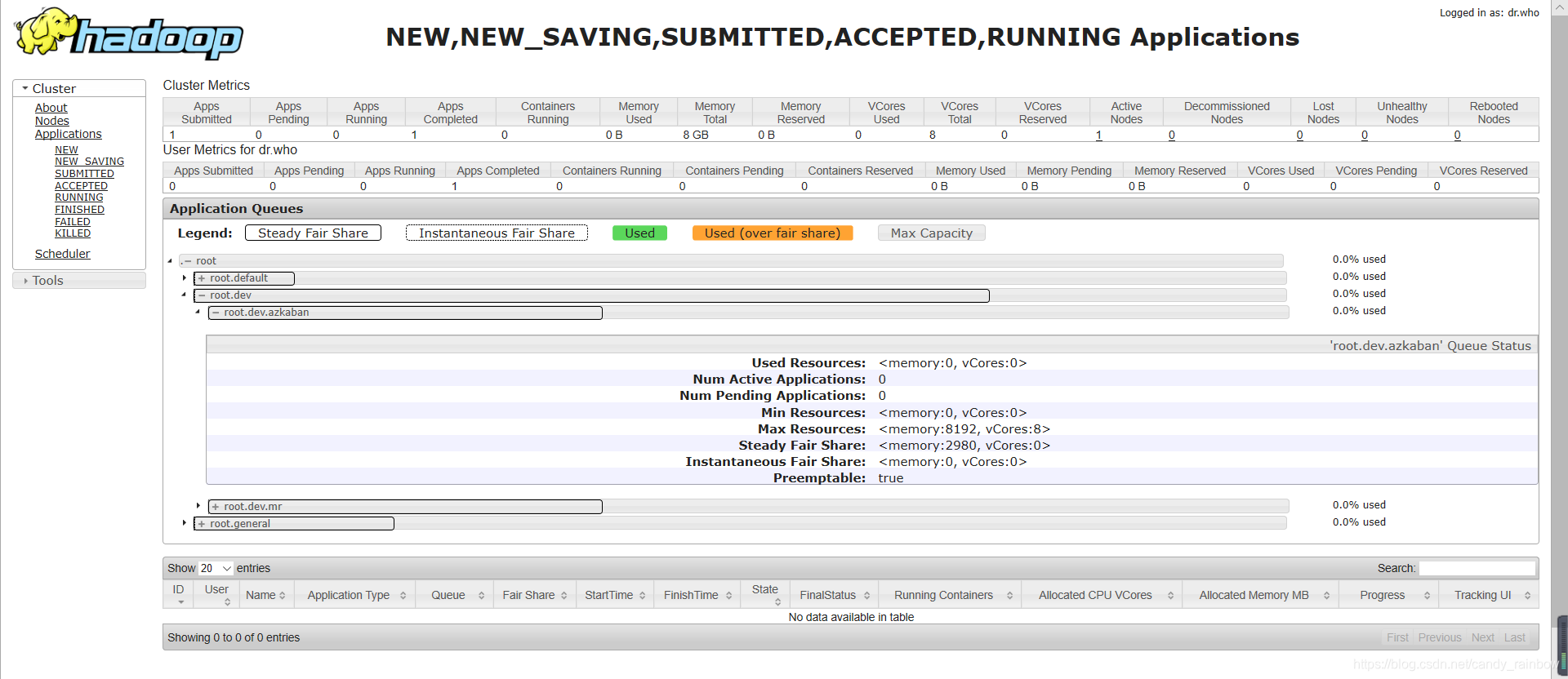 </queue>该配置文件中,队列general占用资源权重20%,dev队列占用权重80%,也就是说,如果集群资源分配比例是1:4,那么此时就认为是公平的。对于dev的子队列mr和azkaban,由于没有分配权重,因此默认都是1,也就是说,mr和azkaban队列平分dev的资源。