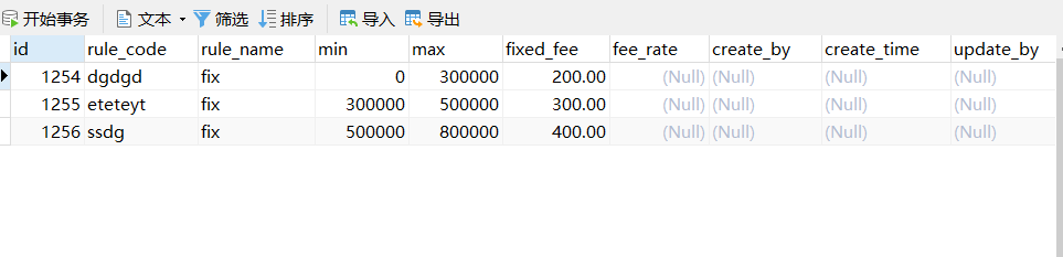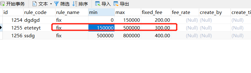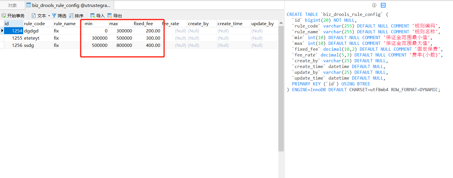 然后创建一个表,用于保存min,max和fixed的参数值(注意事项:template header下边的min,max和fixedFee都相当于声明的参数,但是不能在min上边加一行注释如://参数说明,在解析规则模板时候会把“//参数说明”也当做声明的参数变量),因为这些值可以动态变化了,所以范围规则也相当于可以动态变化,范围就不是之前设置的固定的啦