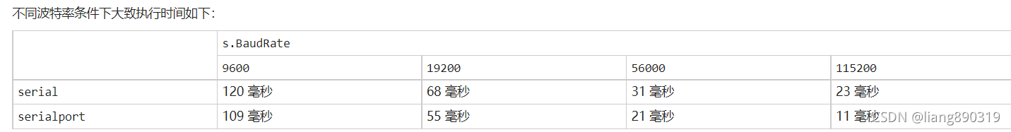 serialport 接口的性能优于 serial 接口。例如,在使用 9600 的默认波特率时,以下代码中使用 serialport 对象写入和读取数据的速度大约是使用 serial 对象写入和读取数据速度的 1.1 倍。